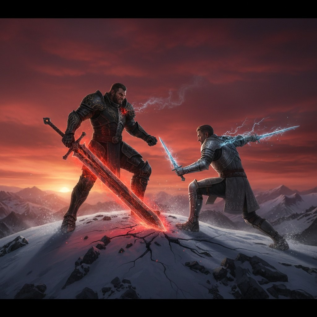 На вершине заснеженного пика, озарённого багровым светом заходящего солнца, столкнулись два могучих воина — представители древних и непримиримых кланов.