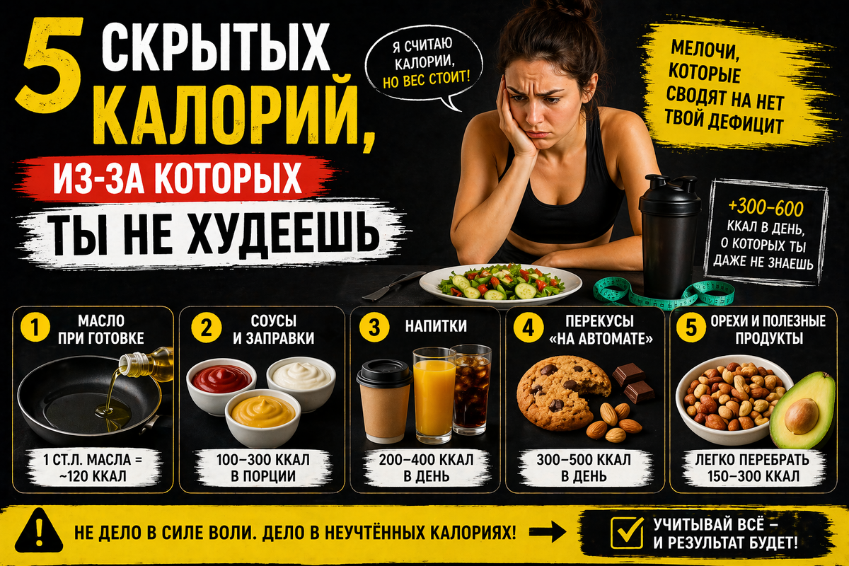 но вес стоит? Очень часто причина — не в «метаболизме», а в скрытых калориях, которые просто не учитываются. Вот где чаще всего теряется результат 👇 Самый коварный пункт. 👉 1 столовая ложка масла = ~120 ккал А теперь честно: 👉 и получаешь +200–300 ккал незаметно Кетчуп, майонез, соевый соус, заправки для салатов… 👉 могут добавить 100–300 ккал к блюду И почти никто их не считает. Калории, которые «не чувствуются»: 👉 легко +200–400 ккал в день Кажется мелочью, но: 👉 за день может набежать +300–500 ккал Да, они полезные.