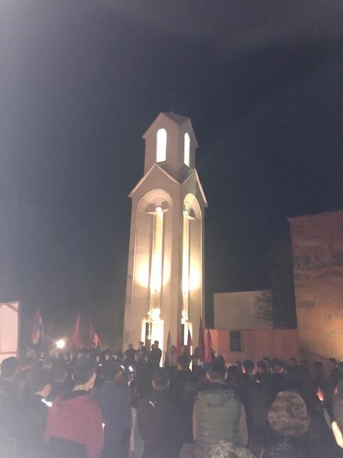 НАКАНУНЕ ПО ИНИЦИАТИВЕ КАРАБАХСКИХ МОЛОДЕЖНЫХ ОБЩЕСТВЕННЫХ ОРГАНИЗАЦИЙ, в частности молодежного крыла партии АРФ «Дашнакцутюн» Арцаха, в г. Степанакерте организовывалось традиционное массовое факельное шествие. Участники шествия собирались у церкви Святого Акопа (также сегодня разрушенного азербайджанским вандалами) и после благословения священника направлялись по центральной улице к столичному мемориальному комплексу, где проводилась поминальная служба по жертвам геноцида. В ходе шествия участники провозглашали: «Помним и требуем!», «Нет геноциду!», «Независимость Арцаху!» и др. В многотысячном шествии принимали участие госслужащие, депутаты, военные, священники, представители гражданского сектора, студенты, школьники, жители и гости Степанакерта. Участники шествия несли огромный флаг Арцаха.
