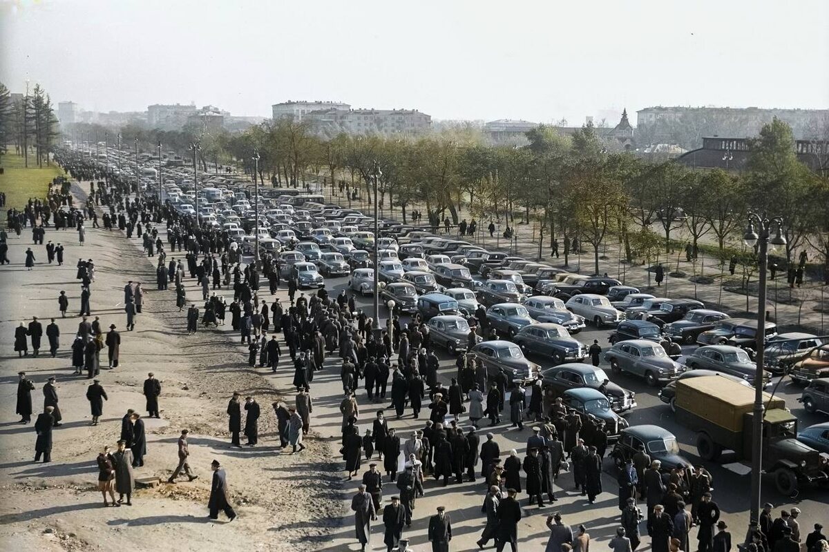 Ленинградский проспект в районе стадиона "Динамо" перед началом футбольного матча. Москва, 1949 год.