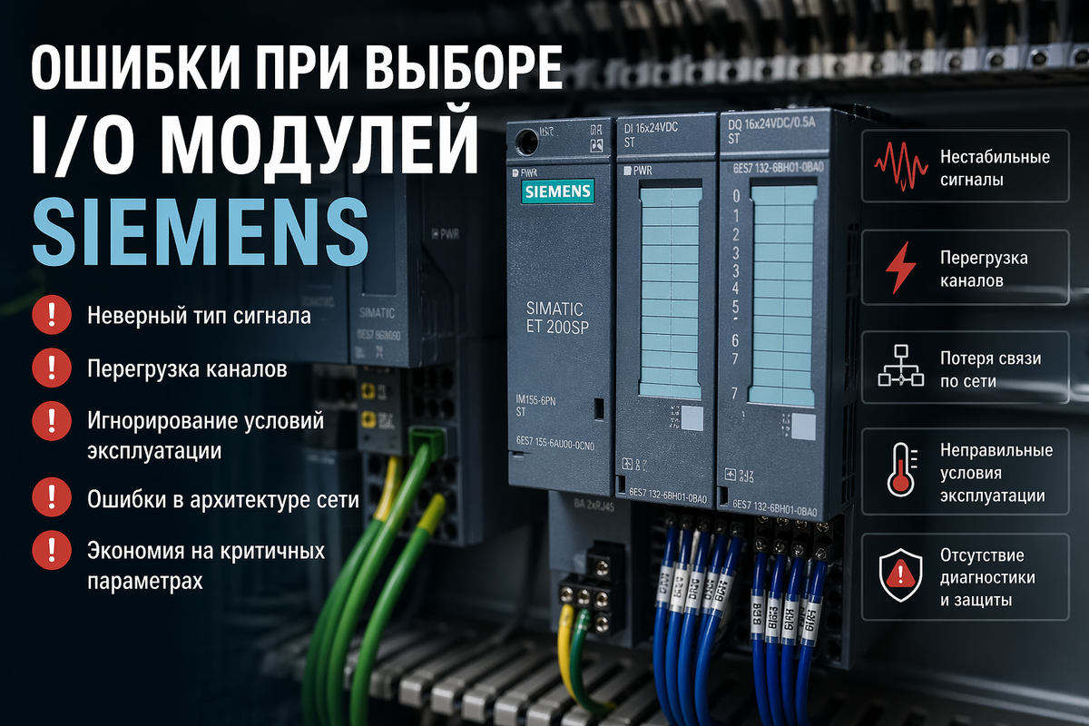 Остановка линии на ровном месте — типовая история, когда “всё было рассчитано правильно”, но через неделю система начинает ловить случайные ошибки по входам. Дискретные сигналы плавают, аналоговые каналы уходят в шум, контроллер теряет связь с удалёнными модулями. На объекте начинают менять датчики, кабель, питание — а проблема остаётся. Чаще всего причина не в “плохом Siemens”, а в неверно подобранных I/O модулях и архитектуре. Ошибка на этапе конфигурации приводит к тому, что система изначально работает на пределе или в неподходящих условиях. И дальше это просто вопрос времени, когда она начнёт сыпаться. Модули ввода-вывода — это интерфейс между полем и контроллером. Именно здесь сходятся реальные сигналы: 24В дискретка, 0–10 В, 4–20 мА, импульсные датчики, энкодеры. Если модуль подобран неправильно, ошибка возникает не “где-то в PLC”, а прямо на уровне сигнала: — перегрузка по току на выходах