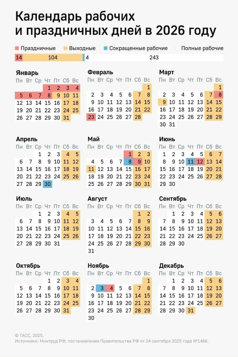 Согласно производственному календарю, с 27 по 30 апреля россиян ожидает четырехдневная рабочая неделя. На следующей неделе граждане будут работать всего четыре дня, после чего последуют три дня отдыха. Стоит отметить, что 30 апреля — предпраздничный день, поэтому рабочий день будет сокращен на один час. А 1 мая, в Праздник весны и труда, россияне смогут насладиться всеми прелестями отдыха. Ранее ТАСС сообщал, что в мае 2026 года россиян ожидает 19 рабочих дней и 12 выходных.