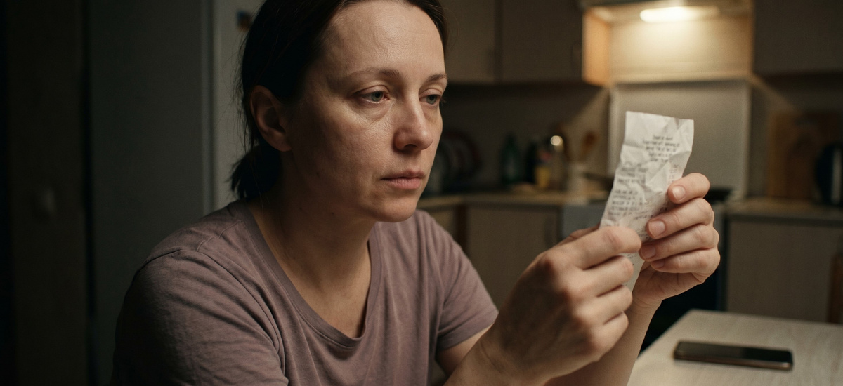 В среду вечером она стоит на кассе в «Магните», механически пикает чужие продукты. Пять часов смены, нога ноет. После работы заскочила сама — сыну нужна школьная форма. Прикладывает карту, а терминал издевательски пищит: «Недостаточно средств». На счёте — две сотни до зарплаты.