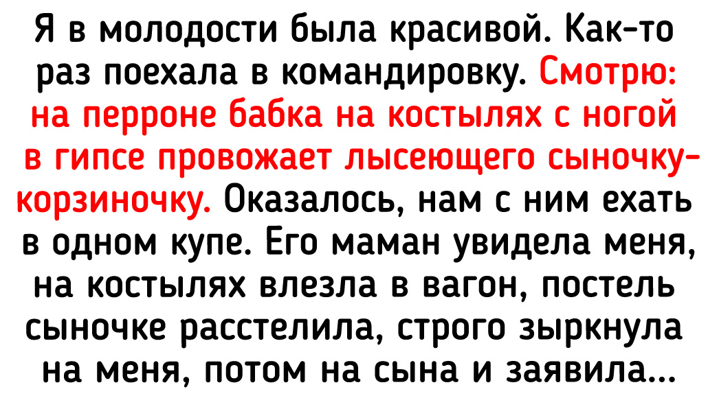 - Я в молодости была красивой. Как-то раз поехала в командировку. Смотрю: на перроне бабка на костылях с ногой в гипсе провожает лысеющего сыночку-корзиночку. Оказалось, нам с ним ехать в одном купе. Его маман увидела меня, на костылях влезла в вагон, постель сыночке расстелила, строго зыркнула на меня, потом на сына и заявила: «Ты тут, сыночек, только ни с кем не знакомься!» Проводник не мог ее выпроводить. В последний момент даму все же высадили, и она в окно мне показала кулак. А сыночка ее с невинным видом так и пролежал всю дорогу, загадочно глядя на меня. © Budem****i / Dzen