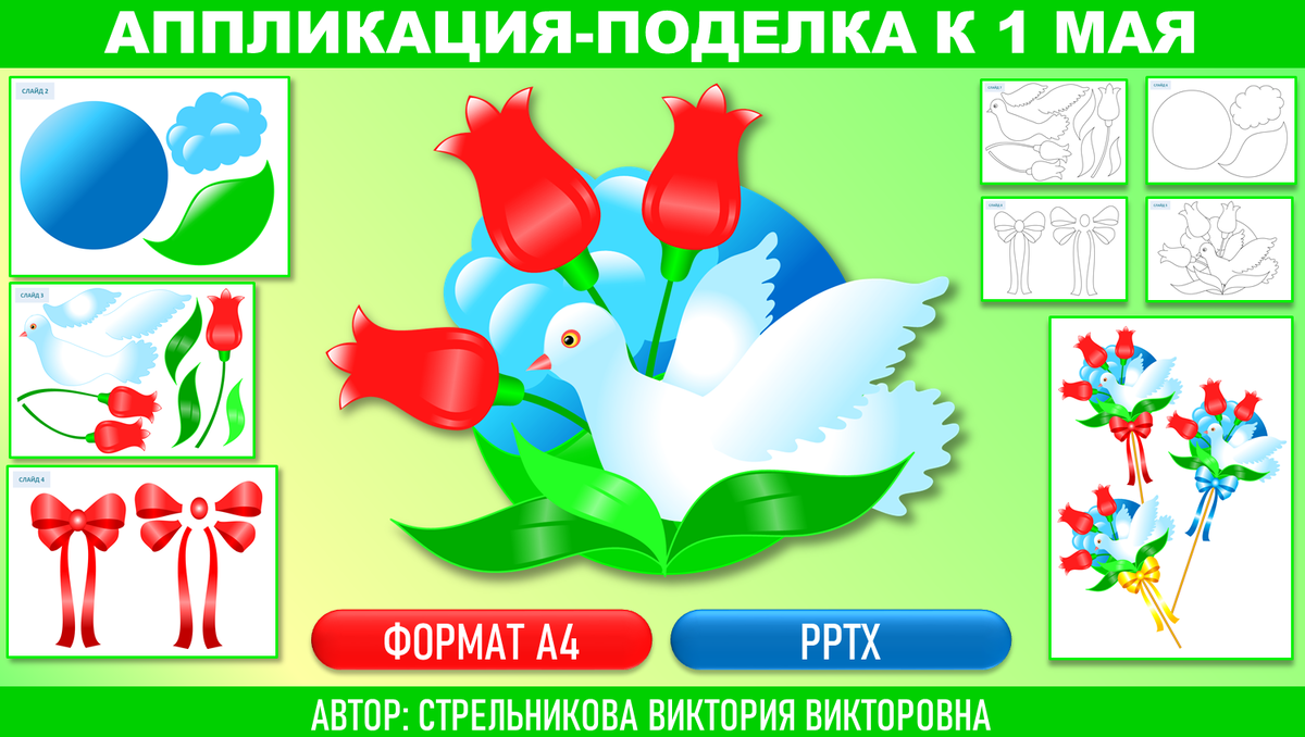 Данная методическая разработка подготовлена Стрельниковой Викторией Викторовной, методистом и педагогом дополнительного образования МБУ ДО ДДЮТ г. Армавира, является авторской, предназначена для педагогов дополнительного образования, педагогов-организаторов, учителей начальных классов, классных руководителей, родителей детей, может использоваться при подготовке учащимися в возрасте от 6 до 10 лет поделок и аппликаций к празднику 1 Мая, для воспитательных мероприятий, организации досуговой деятельности. Представленный дидактический материал состоит из двух презентаций, каждый слайд которых может быть отредактирован. Все изображения созданы средствами программы Power Point, представляют собой редактируемые контуры. Пользователь может изменять каждый контур, способ его заливки, расположение каждого элемента, образующего рисунки. Рассмотрим изображение каждого слайда. На первом слайде размещено изображение готовой аппликации с голубем и цветами на фоне. Каждый элемент рисунка можно редакти