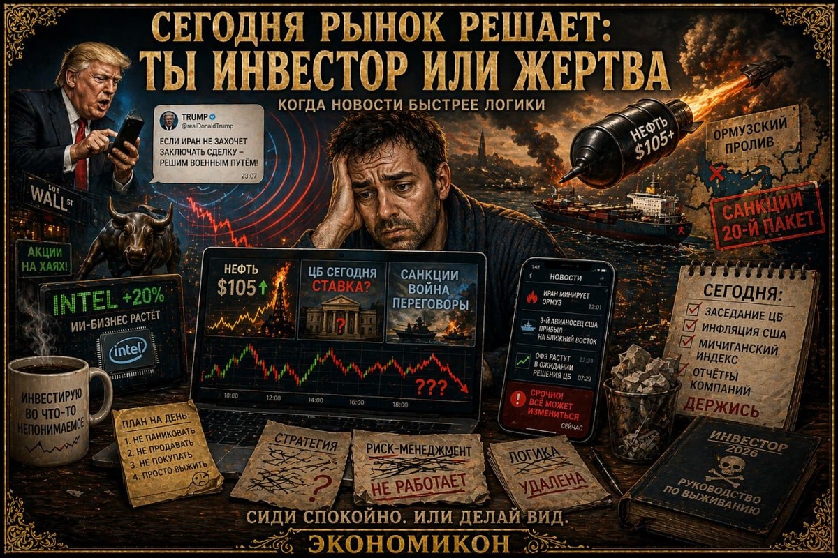 ! На связи утренний дайджест ЭКОНОМИКОН ☕️ Пятница. 24 апреля. Дорогая энергия + дорогие деньги + дорогие ошибки. 📊 РЫНОК НА УТРО — USD: 74,83 — EUR: 87,53 — CNY: 10,94 — Gold: ~4680 — Brent: ~105 — Urals: ~106 (даже дороже ESPO, потому что, а почему бы и нет😅) 👉 Нефть улетает вверх на фоне геополитического цирка. 👉 Золото слегка сдулось. 👉 Рубль делает вид, что он тут главный. 🎯 ГЛАВНОЕ СОБЫТИЕ ДНЯ СЕГОДНЯ — ЗАСЕДАНИЕ ЦБ РФ И не просто заседание, а опорное и максимально неочевидное. Рынок сейчас в состоянии: «Ставку вроде надо снижать… но вдруг не снизят… а если снизят — вдруг это плохо…» 👉 ОФЗ растут на ожиданиях 👉 Но жёсткий сигнал = привет коррекция 🛢 ГЕОПОЛИТИКА: СЕГОДНЯ СЦЕНАРИЙ ПИШЕТСЯ В TWITTER — Иран минирует Ормуз — США подтягивают авианосцы — Трамп: > «Если не договорятся — решим военным путём» — И параллельно: > «Я не стал бы применять ядерное оружие» Очень обнадеживающе Донни... очень... 💥 РЫНОК: ЧТО ВООБЩЕ ПРОИСХОДИТ — Intel +20% → потому что ИИ — BTC →