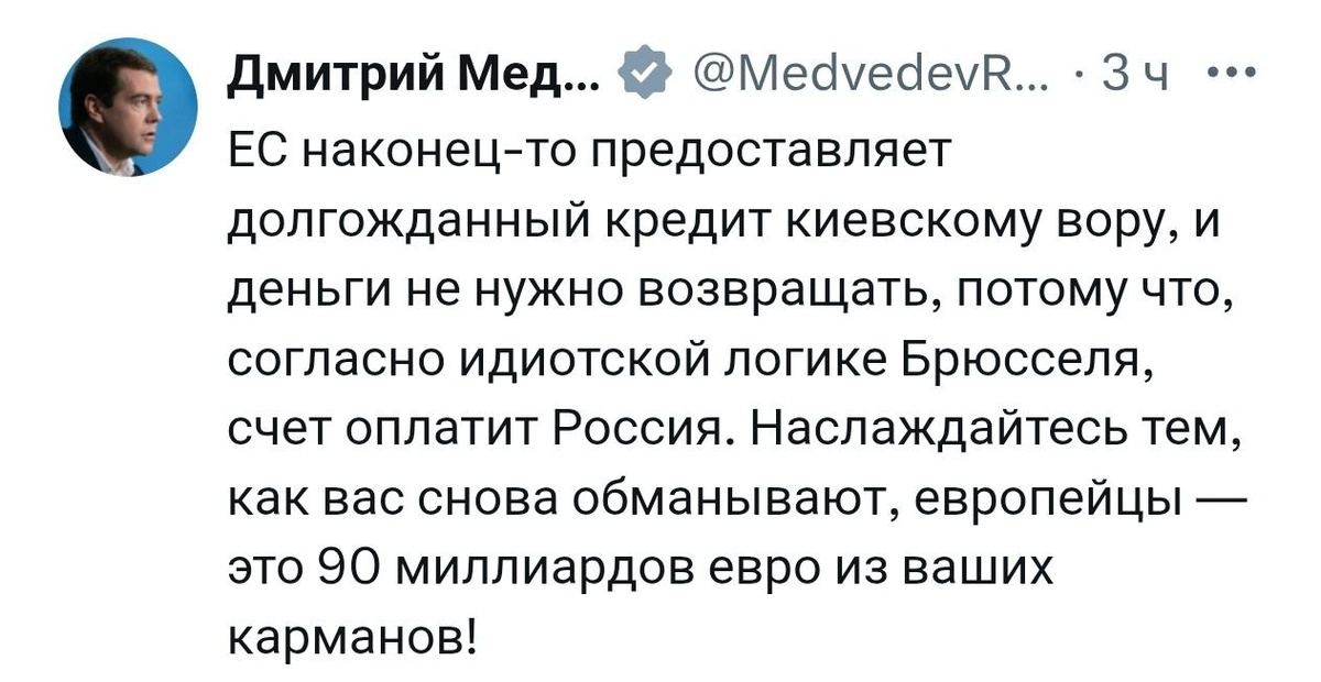«ЕС наконец-то предоставляет долгожданный кредит киевскому вору, и деньги не нужно возвращать, потому что согласно идиотской логике Брюсселя, счёт оплатит Россия. Наслаждайтесь тем, как вас снова обманывают, европейцы — это 90 миллиардов евро из ваших карманов!», — написал зампред Совбеза России. @belrusinfo