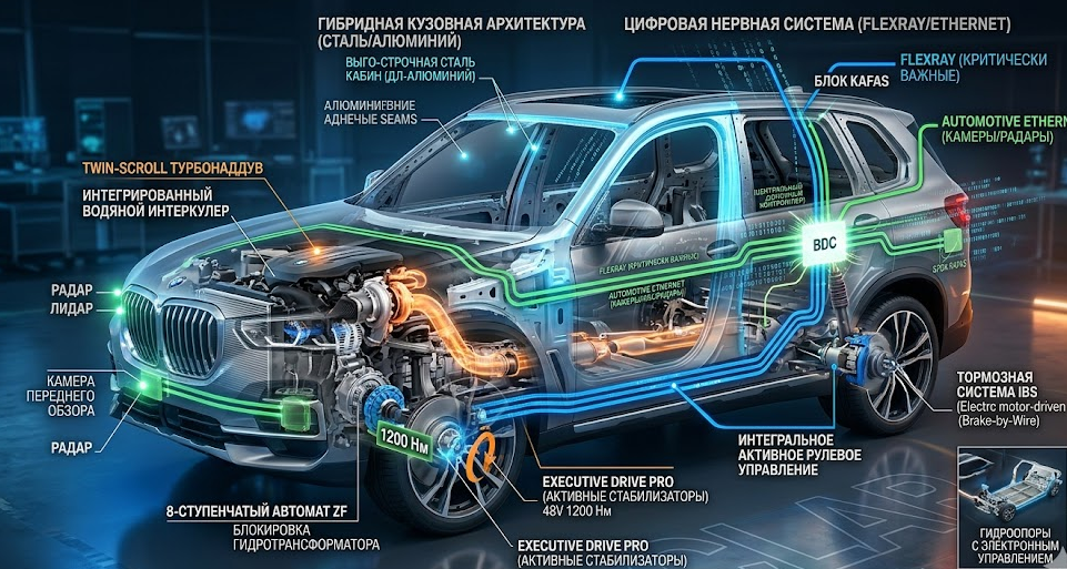 BMW X5 G05 — это не просто эволюция. Это граница, где классическое машиностроение сливается с IT-индустрией. Уровень резервирования систем (дублирование сигналов электронного руля и тормозов), сложнейший термоменеджмент металлов и миллисекундные алгоритмы мехатроники делают его одним из самых технически совершенных гражданских устройств в истории.