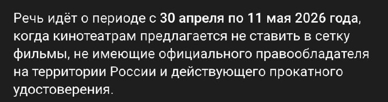 ‼️Все зарубежные фильмы пропадут из российских кинотеатров с 30 апреля по 11 мая