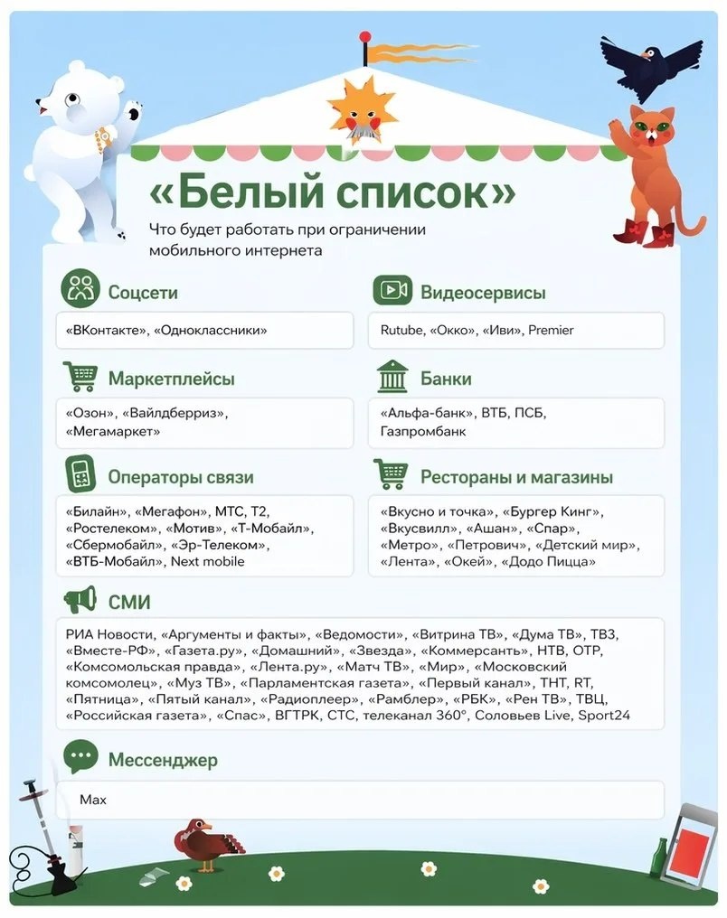 Что нового: – ПСО «ЛизаАлерт» и НКО «Дoбpo.pф»; – интернет-энциклопедия «Рувики»; – Роскачество; – АО «ГЛОНАСС»; – Газпромбанк; – гипермаркеты «Лента» и «Окей»; – сеть предприятий быстрого питания «Додо Пицца»; – онлайн-кинотеатр Premier; – операторы связи «ВТБ-Мобайл» и Next mobile; – телеканал 360°, парламентское телевидение «Дума ТВ» и телеканал Соловьев Live; – онлайн-СМИ Sport24; ИТ-компании 1С, «Труконф», «Цифровые решения регионов»; – платформа кадрового электронного документооборота HRlink; – Федеральное казначейство; – Государственная информационная система электронных перевозочных документов; – Континентальная хоккейная лига В карточках — актуальный перечень ресурсов, которые сейчас есть в «белом списке».