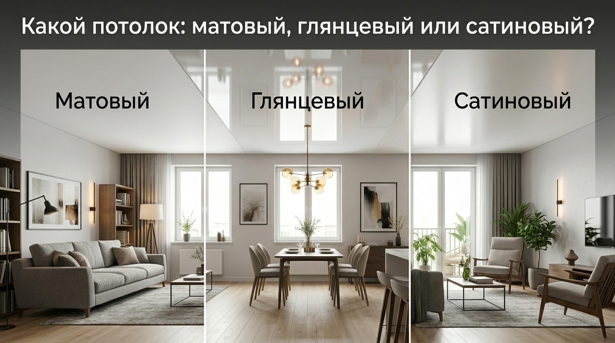 Сатиновый — эффектный, но без зеркального блеска. Компания DEKEN выпускает все три варианта ПВХ-плёнки, и каждый решает свою задачу. Разберёмся, чем они отличаются и какой потолок подойдёт именно вам. Главное отличие — в степени отражения света и визуальном восприятии пространства. Матовая поверхность максимально напоминает идеально окрашенный потолок.