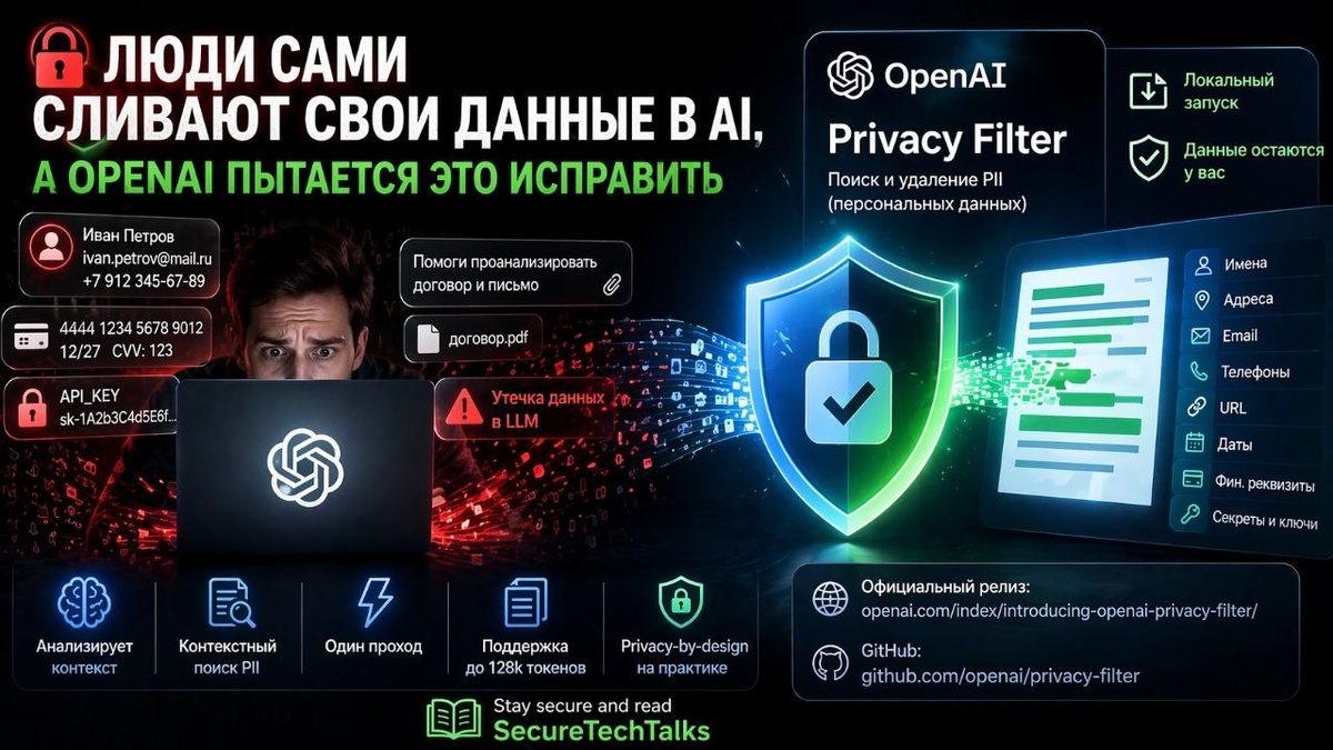 Сегодня речь пойдет о проблеме, о которой все знают, но почти никто не решает. Пользователи массово вставляют персональные данные в диалоги с LLM ( включая креды и номера карт). На днях OpenAI выпустила инструмент, который работает до того, как данные “утекут” в модель. 🧠 Что за штука? Речь про Privacy Filter, отдельную модель для поиска и удаления PII (персональных данных) из текста. В отличие от классических DLP/regex-фильтров, модель не просто ищет шаблоны вроде “@gmail.com” или “+7…”, а анализирует контекст, понимает, где данные публичные, а где приватные, принимает решение прямо в тексте. Инструмент работает в один проход и поддерживает длинные документы до 128k токенов. 🔍 По каким атрибутам работает поиск? Модель покрывает основные категории чувствительных данных: имена, адреса, email, телефоны, URL, даты, финансовые реквизиты и секреты вроде паролей или API-ключей. 💡 Локальный запуск Модель можно запускать локально, т.е. данные не нужно отправлять в облако. Фильтрац