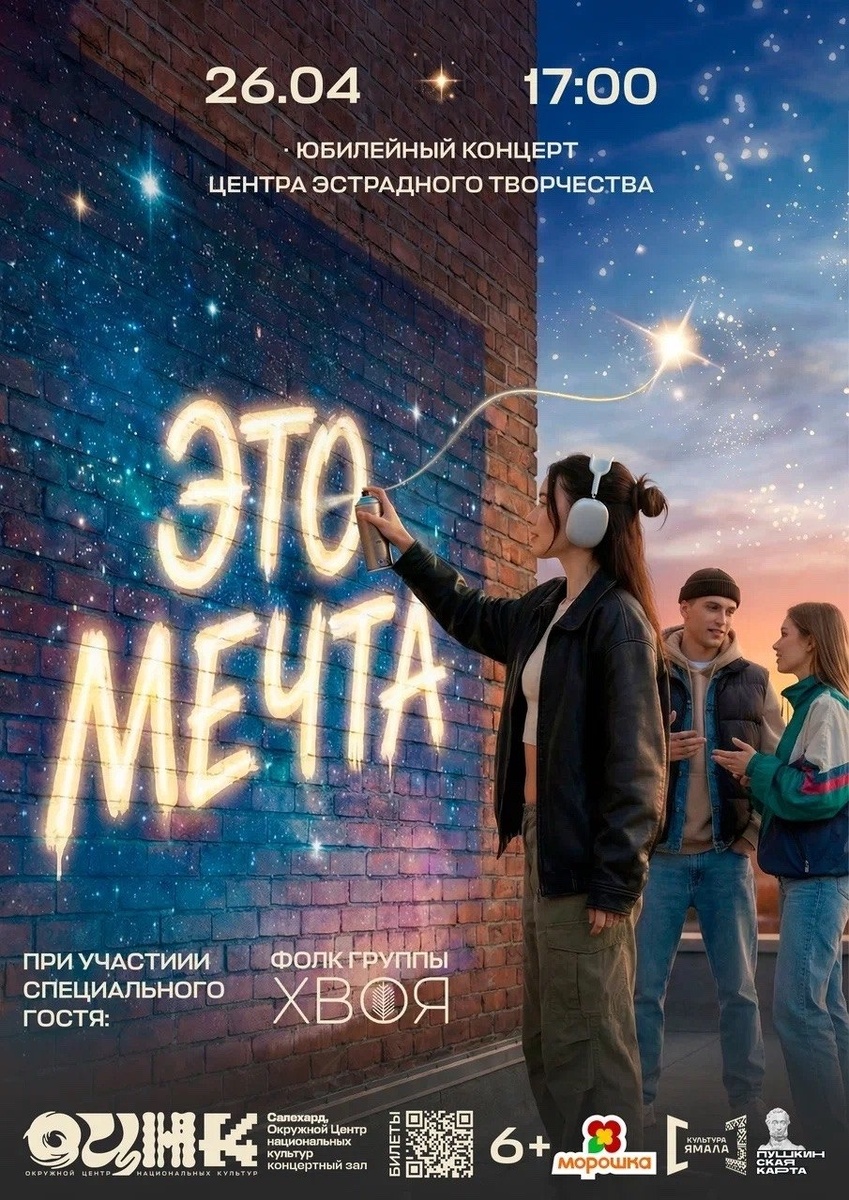 ! Окружной Центр национальных культур приглашает 26 апреля в 17:00 на юбилейный концерт Центра эстрадного творчества «Это мечта»! 30 лет на сцене. 30 лет в ритме музыки. В этот вечер вас ждет калейдоскоп жанров, талантов и поколений, а также выступление специального гостя - фолк-группы ХВОЯ. Билеты доступны по ссылке: clck.ru/3T9bvN, по Пушкинской карте или через сервис «Морошка» со скидкой 20% 30 лет - только начало. Приходите разделить с нами этот праздник!