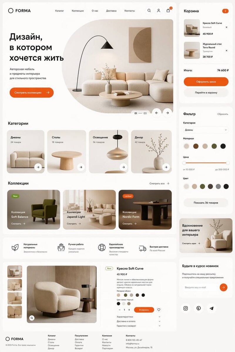 «Изобрази вариант концепции сайта для интернет-магазина дизайнерской мебели. Эстетика, минимализм, круглые кнопки, есть яркий акцент. Изобрази все ключевые элементы сайта»