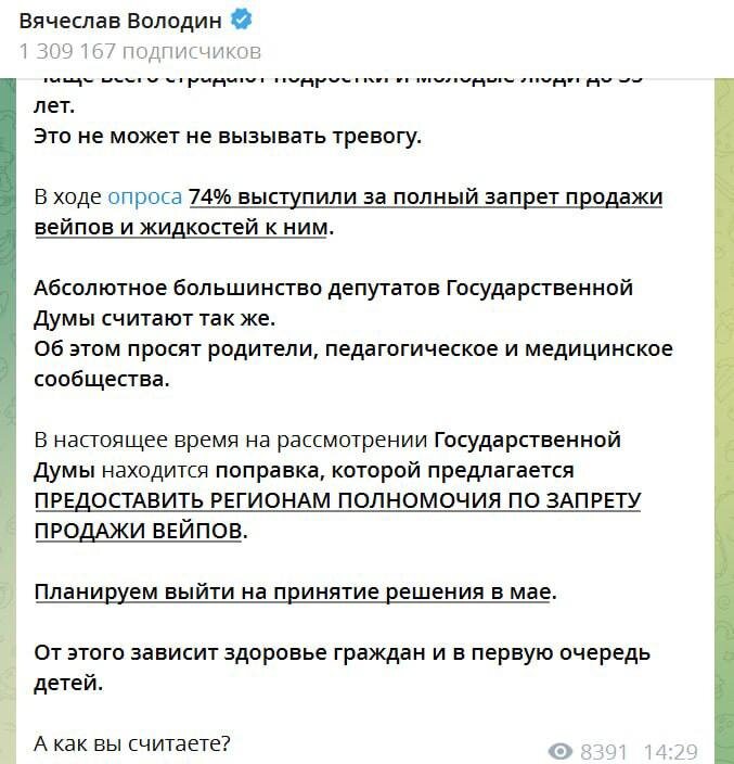 » «В настоящее время на рассмотрении Государственной Думы находится поправка, которой предлагается предоставить регионам полномочия по запрету продажи вейпов. Планируем выйти на принятие решения в мае» — так спикер Госдумы Володин прокомментировал новость о резком росте случаев болезни у вейперов. 👉🏻Новости №1 в Ростове 💌Прислать новость/фото Ростов Папа теперь в Ⓜ️🅰️❌
