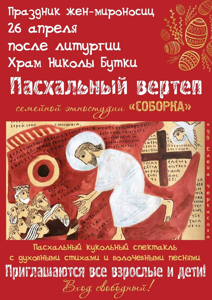 ✨ Пасхальный кукольный театр 🤝Ребята из этностудии СОБОРКА приготовили всем подарок - сразу по окончании Божественной литургии покажут вам свой пасхальный кукольный театр с духовными стихами и волочебными пасхальными песнями🐣! ⭐Запланируйте остаться после службы буквально на 40 минут, спектакль недлинный, но очень интересный! 🚫 Возраст: 0+ 📆 26.04.2026 🏢 Храм Николы Бутки 📍 г. Серпухов, ул. Чернышевского, д. 12 💰 Вход свободный❗️ ⭐Поддержать канал голосом 💰 Канал Вакансии Серпухова ✅ Мероприятия Серпухов https://dzen.ru/id/66f01c6eb4c6fe60c9ca1608 https://vk.ru/serpukhov_events http://dzen.ru/serpukhov_events