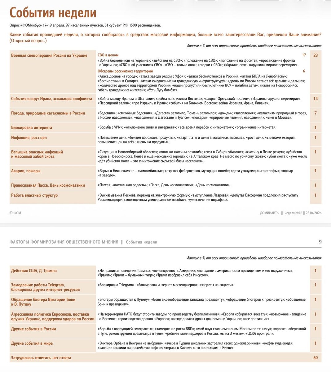 Поле мнений. Выпуск 16 События недели и настроение окружающих Результаты еженедельного опроса 17–19 апреля 2026 года. Полный выпуск: fom.ru #доминанты #ФОМнибус 📲 ФОМ в МАХ 💙 ФОМ в ВК 📱 Фонд Общественное Мнение