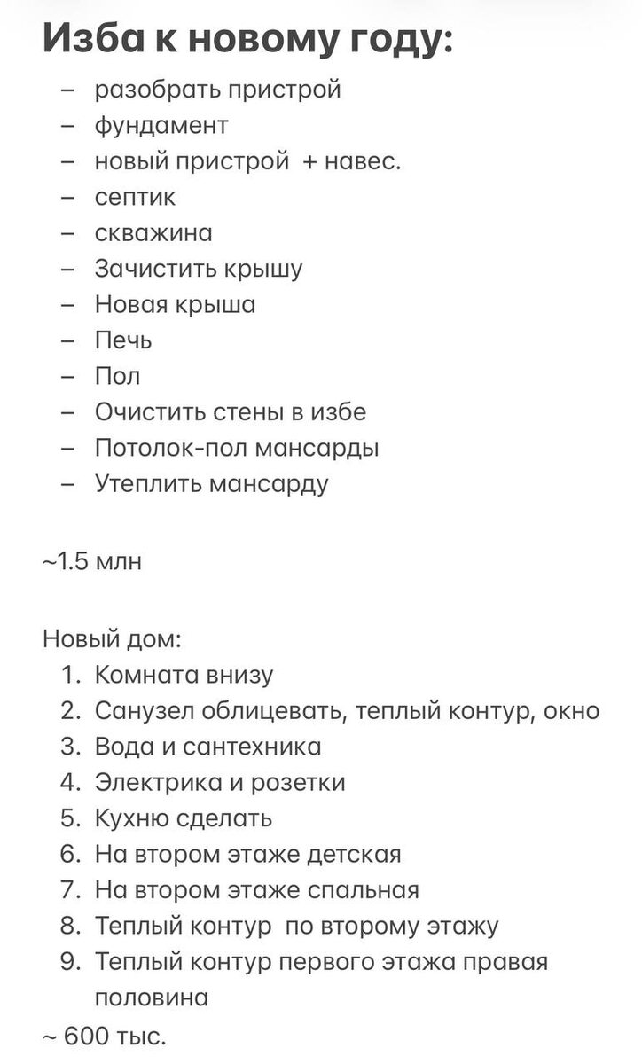 Я думаю реально (но сложно) к НГ в избе завершить все объемные, сложные работы и перейти к декорированию и внутренней отделке. Сумма с +- миллион выросла по очень грубым подсчетам до 1,5. Думаю в итоге будет 2млн. Но в новом доме все оптимистично (относительно избы 😅). Чтобы там можно было жить в половине дома, а это 2 спальных и кухня-гостиная на 15м2 с ванной комнатой на первом этаже, нужно всего тыс.600. Я надеюсь, смогу 🤞🏻 ежемесячно на протяжении года вкладывать далее +- 200 тыс.в месяц в стройку. Если очень постараться. Если все к херам не обрежут и не заблокируют окончательно 😵💫 И еще надо сделать полукруглую террасу возле обрыва, с очагом. Там, на берегу я хочу встречать свои 37, 10го мая. Просто захотелось зафиксировать план наконец, все записать ибо все это по кругу в голове перебирается. Имея список проще и спокойнее. И ясно, что это на год дел, как минимум. Можно, конечно, за пару месяцев все сделать, но тут денежный вопрос. Заработать 2 с лишним свободных миллион