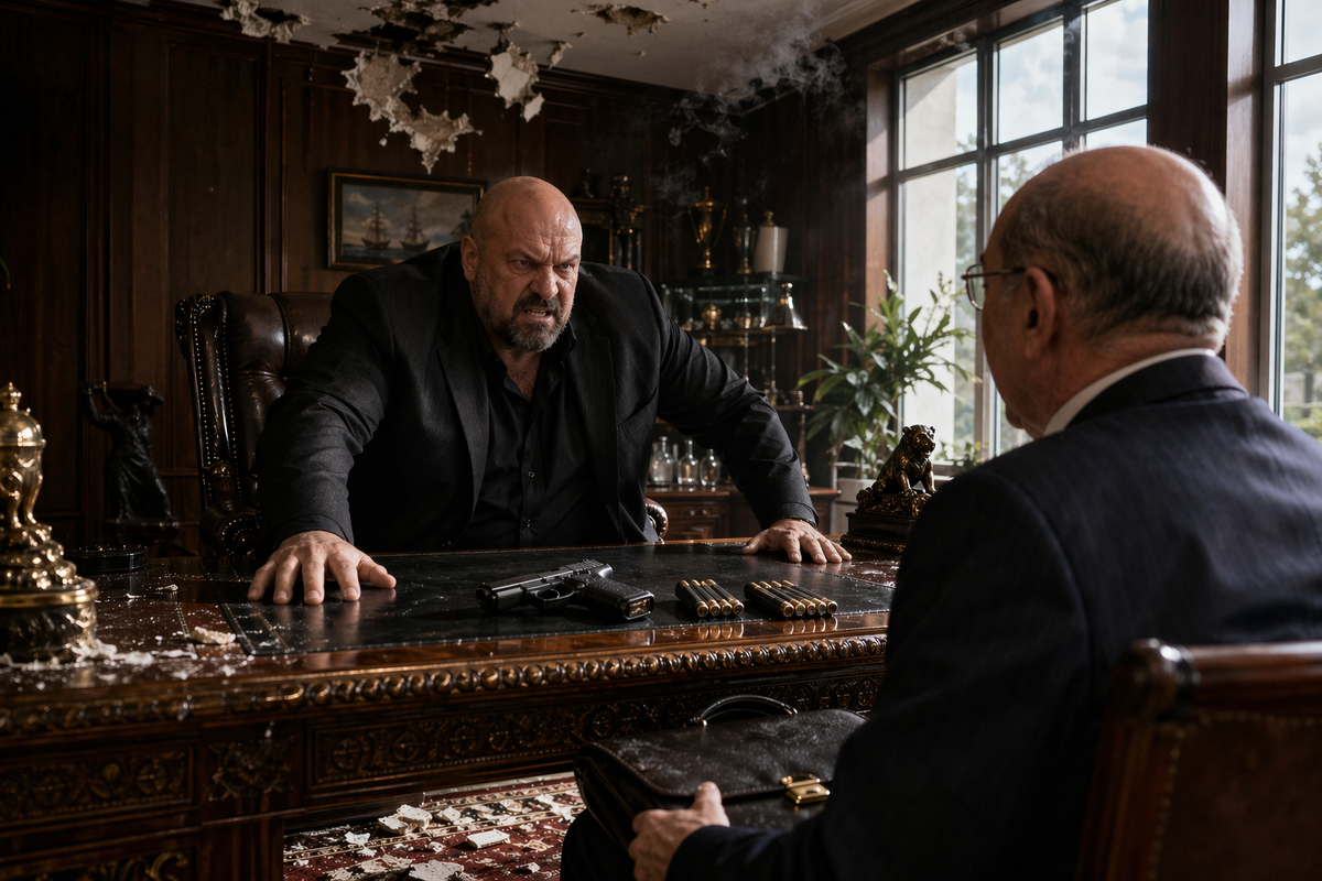 Глаза охраны судорожно обшаривали пространство в поисках угрозы. Увидев шефа стоящим посреди кабинета с пистолетом в руке и без единой царапины, матрос на мгновение опешил. Он перевел взгляд на изрешеченный потолок, на засыпанный мусором пол и, кажется, начал понимать, что произошло нечто из ряда вон выходящее, но никак не покушение.