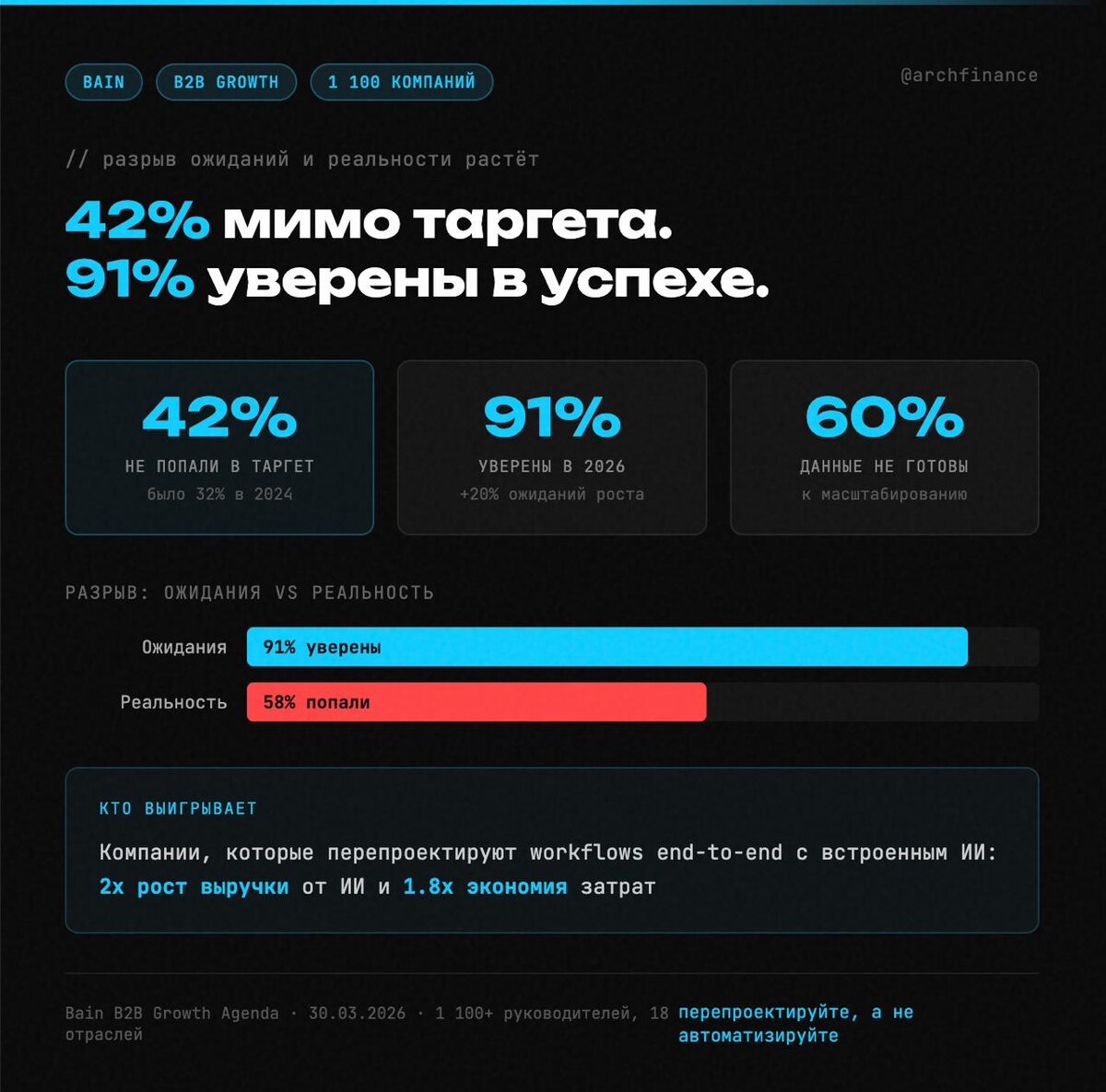 Результаты B2B Growth Agenda 2026 — учебник по когнитивным искажениям в корпорациях. В 2025 году 42% компаний не попали в таргет по выручке. Годом ранее — 32%. Тренд очевиден. Но вот что интересно: на 2026 год компании ожидают ещё больший рост выручки (+20%). И 91% уверены, что достигнут целей. Разрыв между ожиданиями и реальностью не сужается — он расширяется. 90% экспериментируют с ИИ. Но 60% признают: данные не готовы к масштабированию. То есть технология есть, а фундамент — нет. Единственные, кто реально выигрывает: компании, которые перепроектируют workflows end-to-end с ИИ внутри, а не прикручивают его сбоку. У них 2x рост выручки от ИИ и 1.8x экономия затрат. Автоматизировать хаос — получить быстрый хаос. Перепроектировать процесс — получить результат. Разница между этими подходами стоит десятки процентов маржи. Подробнее о метриках для борда — тут, а про ROI-калькулятор — тут. #CFO #ИИ #стратегия — 📱 Макс · 📖 Дзен · ✈️ Telegram · 🌐 hr-s.ru