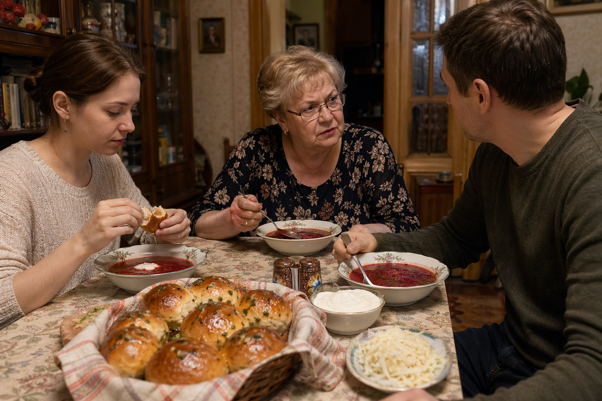 Борщ у тёщи всегда выходил густым, свекольно-вишнёвого оттенка, с ароматом, который ещё в лифте начинал щекотать ноздри. Лавровый лист, чеснок, томатная кислинка – всё смешивалось в плотный дух сытости. На противне под полотенцем отдыхали пампушки – поджарые, глянцевые от сливочного масла, которым она их протирала перед тем, как подать к столу. Тамара Петровна разливала первое по тарелкам с выверенной неторопливостью, каждому – по ложке густой сметаны, и наблюдала, как та расходится белыми разводами в горячей глубине.