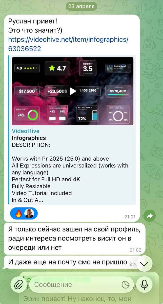 👨🎓 Вчера мне написал мой ученик Эрик — приняли его первый проект Infographics 👨💻 До этого Эрик получил пару реджектов, но на этот раз все получилось! Даже если у вас что-то не получается, никогда не опускайте руки! 🔥 Эрик, еще раз мои поздравления, желаю как можно больше аппрувов и новых проектов #проекты #стоки #aftereffects #videohive #envatoelements