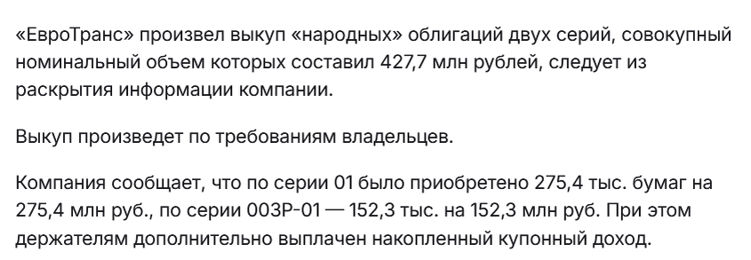 У ПАО "Евротранс" эта неделя выдалась бурной. Началась она с сообщений о неисполнения выкупа так называемых "народных облигаций" на сервисе "Финуслуги": Потом пришла информация, что эмитент все-таки выкупил эти облигации. Также были переведены деньги по очередным купонам облигаций, торгующихся на Московской Бирже. Но в итоге Евротранс ушел в технический дефолт по другому инструменту: ЦФА (цифровой финансовый актив). Такие противоречивые события вызывали резкие колебания цен на акции и облигации. Последние даже становились на планки на утренних и вечерних торгах, когда колебания цен более ограничены, а новости по выплатам приходили именно в это время. Прервали свое молчание и наши апологеты Евротранса: Евгений Коган Владимир Левченко: Вышли они с сообщениями в один день, когда Евротранс перевел очередной купон по биржевой облигации (на случаях дефолта они хранили олимпийское молчание): Я передал эти нарративы независимому судье в лице ИИ (Copilot) и вот, что он ответил: