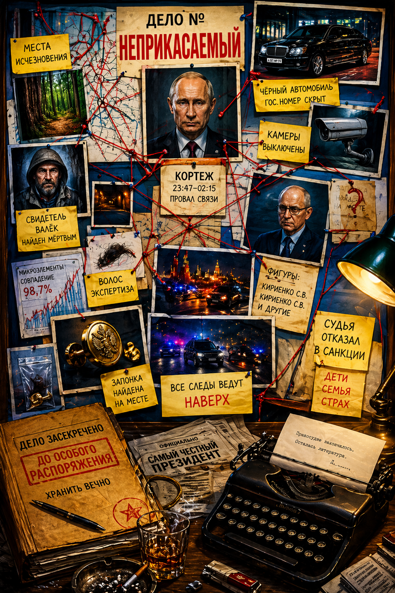 — Эпизод второй. Свидетель. Бомж Валёк, который ночевал в теплотрассе недалеко от того места. Он, когда его нашли, трясся и твердил про «чёрную-чёрную ночь» и что «они вышли из леса, а не из города». Все списали на белую горячку. Я — нет. Я протокол дописал дословно, а там была такая фраза: «Один смеялся, как гиена, а второй ему сказал: «Владимир Владимирович, пора заканчивать»». Валёк, конечно, мог имя от фонаря ляпнуть, но я сразу подумал: отчество-то он не выдумал бы. Он газет не читает. Но самое поганое: на следующий день Валька нашли мёртвым. Сердечный приступ, якобы. И допрос мой из дела исчез. Не засекретили — просто вырвали страницы и забыли в электронной базе удалить, а потом спохватились через месяц.