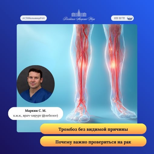 Тромбоз глубоких вен (ТГВ) - это состояние, при котором в вене образуется сгусток крови, мешающий нормальному кровотоку. Иногда врачи называют тромбоз «неспровоцированным», если он случился без очевидных факторов, таких как недавняя крупная операция, серьезная травма с переломами или долгая неподвижность в больнице. ‼️ Вам важно знать: венозный тромбоз может быть самым первым признаком скрытого онкологического заболевания, которое еще никак себя не проявило. Согласно медицинским данным, у 4–12% пациентов, столкнувшихся с тромбозом «без причины», в течение следующего года обнаруживают опухоль. Чаще всего такая связь прослеживается при раке поджелудочной железы, почек, яичников, легких или желудка. Как проходит поиск причин? Если у вас случился неспровоцированный тромбоз, врач предложит пройти онкопоиск. Это не значит, что вам сразу назначат КТ всего тела. Современные рекомендации выделяют две стратегии: 🌷Базовый поиск: включает тщательный медицинский осмотр, анализы крови, рентген