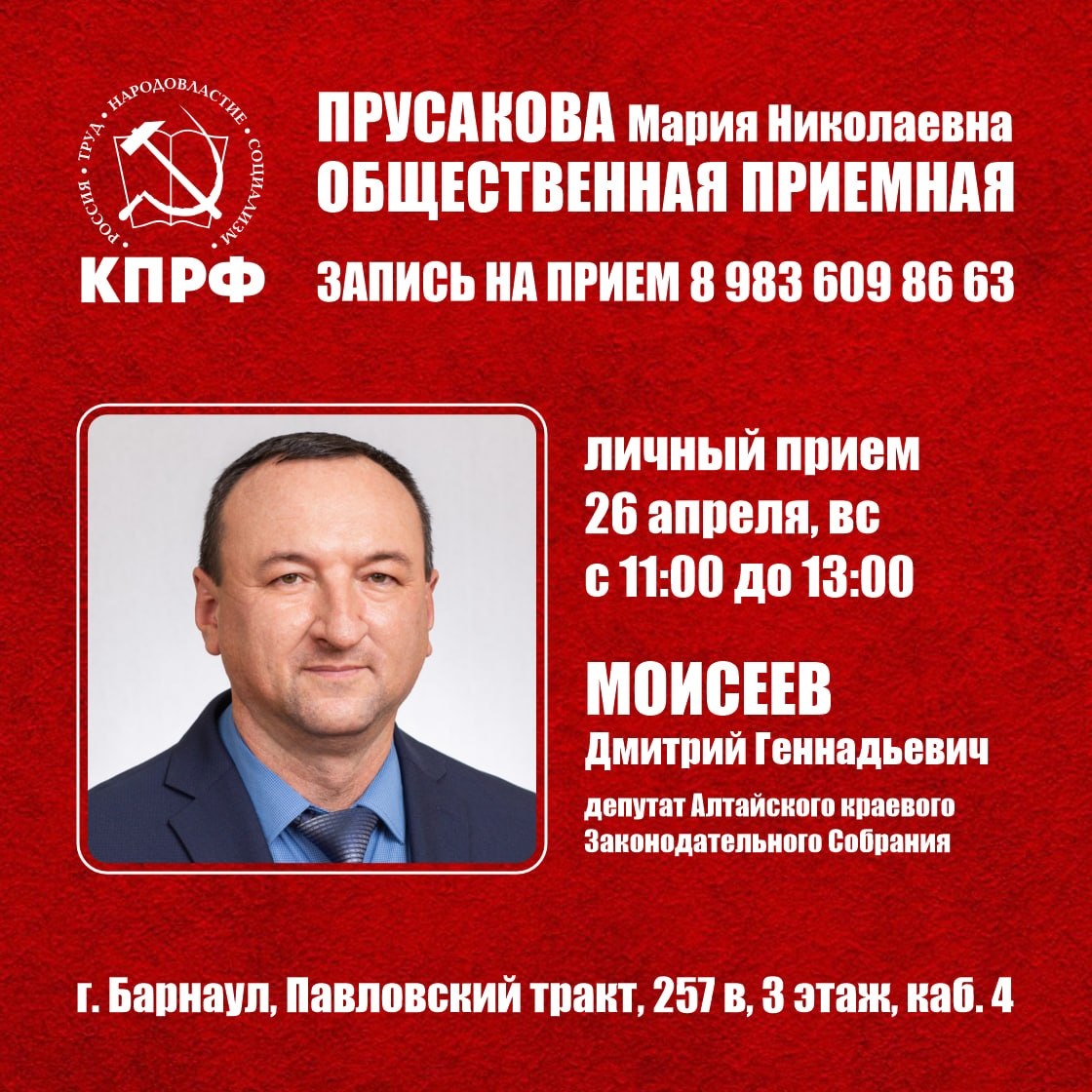 : г. Барнаул, Павловский тракт, 257в, 3 этаж, каб. 4. 📌26 апреля, вс, 11:00 – 13:00, МОИСЕЕВ Д.Г., депутат АКЗС ☎️ Предварительная запись по тел. 8-983-609-86-63