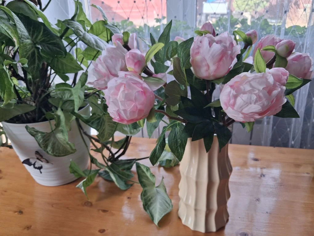 Это не пучок, не 7 бутонов на одном стебле, а отдельные 7 высоких и пышных пионов, в вазе смотрятся красиво. Когда еще георгины и астры на клумбе зацветут? А букет, пусть и не настоящий уже стоит на столе, радует. Зато не завянет. Мне нравится, а вам?