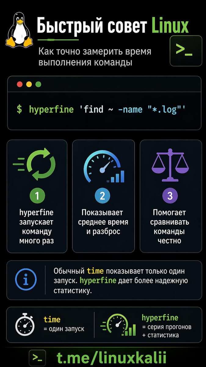 ” Когда команда выполняется медленно, один запуск ничего не доказывает. Сегодня она попала в кеш, завтра система была загружена, послезавтра результат вообще другой. Для нормального замера есть hyperfine. Он запускает команду несколько раз, делает прогрев, считает среднее время, минимальное и максимальное значение, а также показывает разброс. То есть ты видишь не случайный результат, а нормальную статистику. Пример: hyperfine 'find ~ -name "*.log"' Особенно полезно, когда сравниваешь два варианта одной команды: hyperfine 'grep -r "error" .' 'rg "error" .' Так сразу видно, что реально быстрее, а что просто “казалось оптимизацией”.
