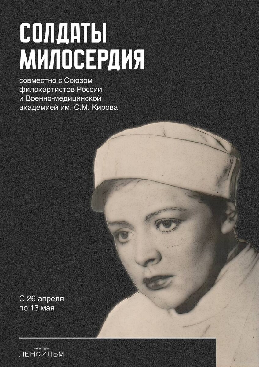 » 📍26 апреля в 16:00 на Ленфильме пройдет торжественное открытие выставки при поддержке Союза филокартистов России и Военно-медицинской академии имени Сергея Мироновича Кирова. На выставке будут представлены открытки из личной коллекции вице-президента Союза филокартистов России Виктора Георгиевича Палагнюка и материалы, предоставленные Военно-медицинской академией имени С.М. Кирова, а также архивные материалы киностудии «Ленфильм». В день открытия курсанты проведут мастер класс по оказанию полевой медицинской помощи с оборудованием, предоставленным Военно-медицинской академией. 😊 Вход свободный. #ЛенфильмРекомендует