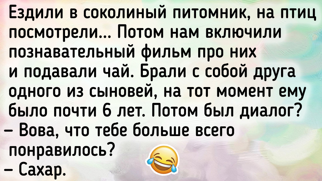 Ездили в соколиный питомник, посмотрели на птиц. Потом нам включили познавательный фильм про них и подавали чай. Брали с собой друга одного из сыновей, на тот момент ему было почти 6 лет. Потом был диалог?