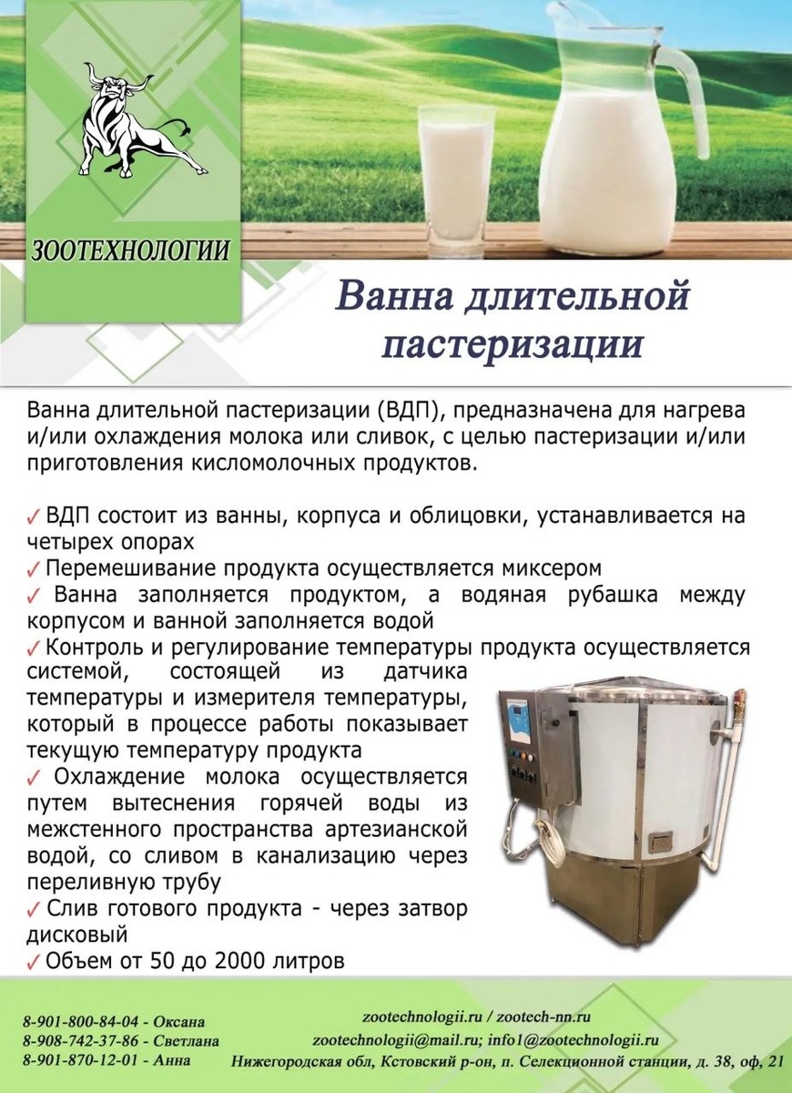 Добрый день 🍶 Ванна длительной пастеризации молока (ВДП) — это специализированное оборудование для термической обработки молока при невысокой температуре в течение продолжительного времени. Такая пастеризация называется длительной (низкотемпературной) и осуществляется при температуре около 63–65 °C в течение 30 минут. 🌟 Длительная пастеризация позволяет уничтожить патогенные микроорганизмы (например, туберкулёзную палочку, сальмонеллу, кишечную палочку), при этом максимально сохраняя натуральные свойства молока: вкус и запах, структуру белков, полезные микроэлементы, условно полезную микрофлору (при неполной пастеризации). ⚙️ Такая технология широко используется: ✅ при производстве сыра, йогурта, сметаны; ✅ для бутылочного и фермерского молока; ✅ в детском и диетическом питании; ✅ в учебных и исследовательских целях. Оставить заявку можно у наших менеджеров: Оксана: 8-901-800-84-04; 8-908-760-45-22 Светлана : 8-908-742-37-86 Анна: 8-901-