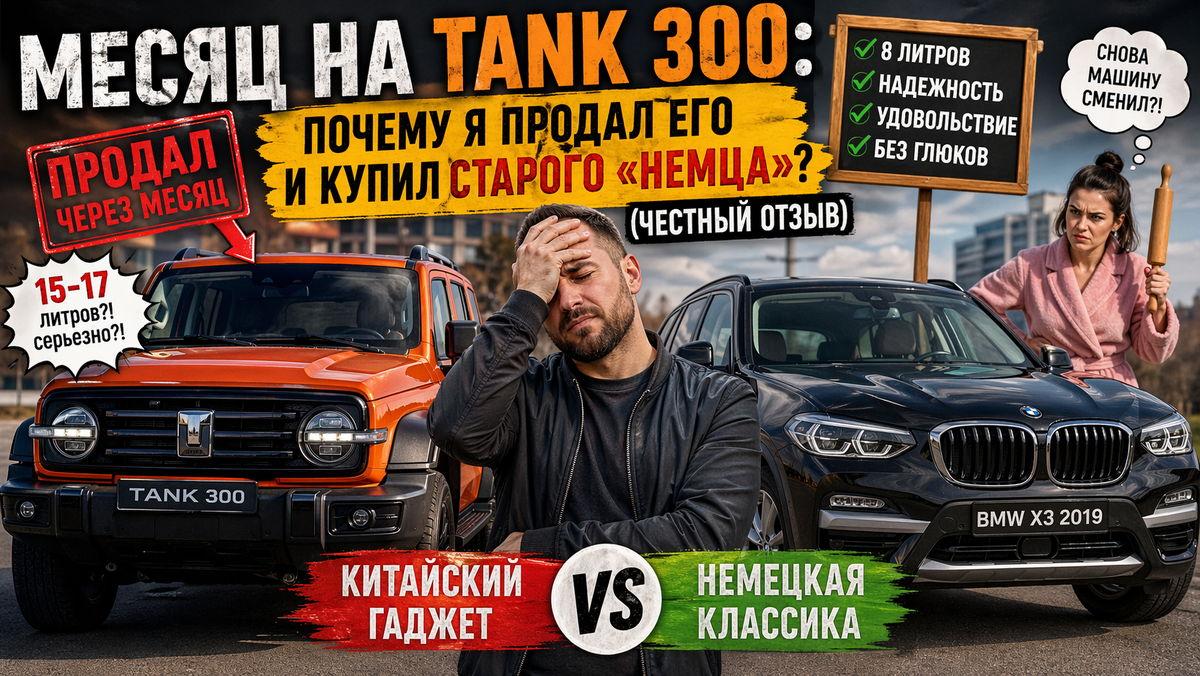Знаете это чувство, когда новая игрушка блестит ярче, чем старый надежный друг? В моем случае игрушкой был Tank 300, а другом – подержанный BMW X3 2019 года. Я всегда считал себя прагматиком. Но хайп вокруг китайских рамных внедорожников сделал свое дело, и я решил «попробовать». Спустя месяц я вернулся к "немцу" и сейчас расскажу вам: почему сыр в этой мышеловке оказался не таким вкусным, и за что я готов простить баварцу его вмятину на заднем крыле. Месяц назад я стал обладателем новенького, пахнущего пластиком и китайским счастьем, Tank 300. Топовая комплектация, бежевый салон, огромный вертикальный экран — все как я люблю. Первые дни были сказкой. Сосед с «Прадиком» косился с завистью. Моя супруга, наконец, перестала критиковать мою привычку менять авто каждые два года. Я чувствовал себя покорителем Эвереста, паркуясь у бордюра. Экран — 14,6 дюйма! Машина едет, вернее, плывет над ямами. Сажусь в него, и кажется, что я – король вселенной. Прямо до первой заправки. 15-17 литров на с
