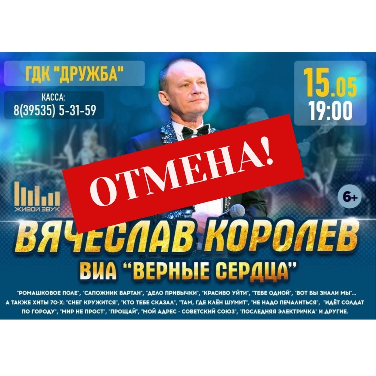 ! Концерт Вячеслава Королева и ВИА "Верные сердца", запланированный на 15 мая в 19.00, отменяется. Возврат билетов осуществляется так же, как их приобретение: через кассу ГДК “Дружба” 8(395-35)-5-31-59 или через сайт Сибкасса:https://sibkassa.ru/events/concerts/vyacheslav-korolev-via-vernye-serdtsa_7246