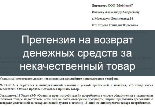уплаченной за товар ненадлежащего качества денежной суммы