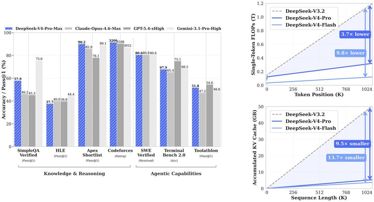 Тихо не спеша, без суеты, китайцы выпустили свой долгожданный обновленный флагман в 4 версиях Подогрею интерес, она обогнала новый Kimi K2.6 DeepSeek-V4-Flash и DeepSeek-V4-Pro. Обе поддерживают контекст до 1 млн токенов, максимальный вывод до 384K + tool calls и JSON output, то есть речь не просто о чатике поумнее, а о модели, которую сразу проектируют под серьёзные продуктовые и агентные сценарии У моделей thinking mode включён по умолчанию, режим можно отключить и переключиться на non-thinking, если нужна скорость На выходе получили продукт для продакшна. Совместим с OpenAI- и Anthropic-форматами API, а старые имена deepseek-chat и deepseek-reasoner постепенно связываются с режимами deepseek-v4-flash Стоит $0.14/$0.28 за 1М токенов Flash и $1.74/$3.48 Pro Пишут что уже можно попробовать в веб версии HuggingFace
