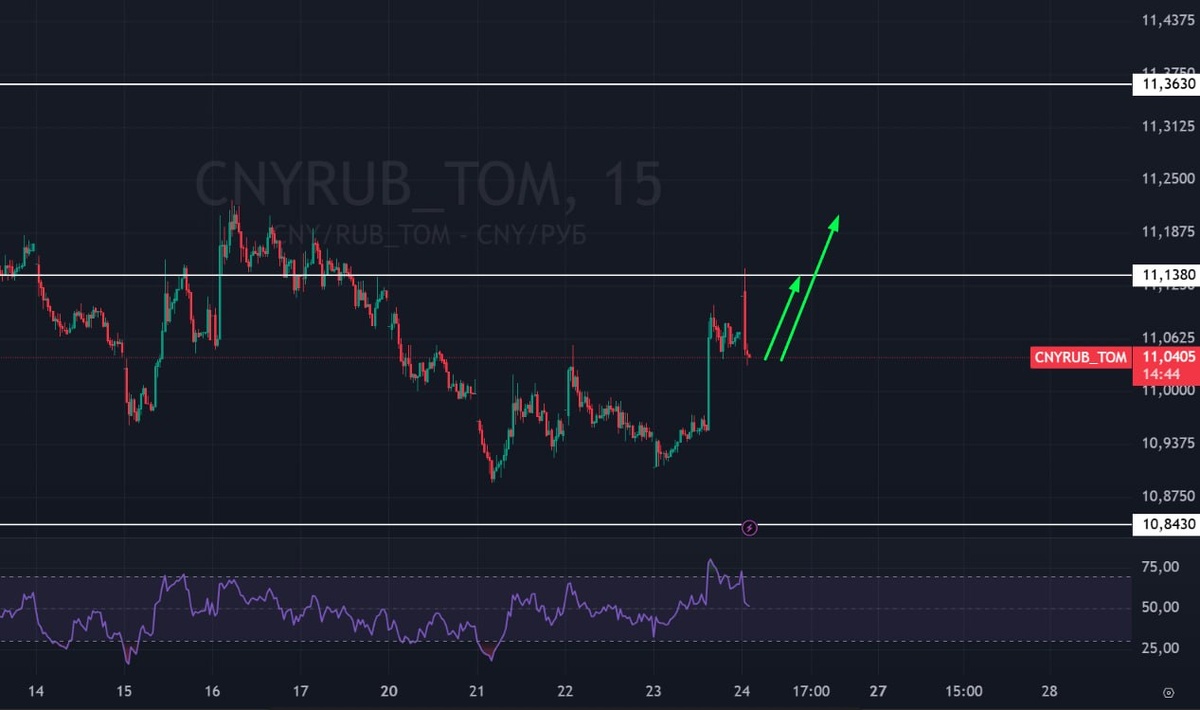 🟢 Сегодня по юаню ударились в 11,14! Есть первые признаки разворота. Путин на прошлой неделе обозначил, что экономические показатели плохие, бизнес передушили с целью подавить инфляцию. После чего инфляция стала нулевой, Силуанов обозначил, что государство теперь будет пылесосить валюту по новому бюджетному правилу, а глава Минэкономразвития Максим Решетников заявил, что задача по снижению инфляции решена. Курс взят на латание бюджетной дыры, а у нас в России нет механизма проще и топорнее, как сделать это через девальвацию. 🟢Так что жду откуп валюты. Идеальное закрытие пары юань-рубль выше 11,14. На это сегодня так же повлияет решение по ставке со стороны ЦБ. 🚗 Жду валюту вверх. первая цель 11,14+, и далее рост. #юаньрубль #юань #прогнозрубля #рубльдоллар #cnyrub #cnyrubf #bogdanoffinvest $CRM6 $CRU6 $CNYRUB $CNYRUBF