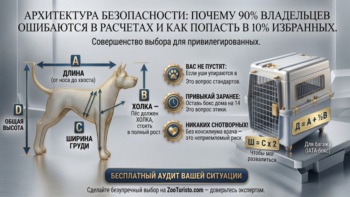 ". Как выбрать переноску и не провалить посадку? Сборы собаки в самолёт - это не только про документы. Это про то, как ваш друг перенесёт эти часы: в стрессе или в относительном комфорте. Ловите базу, которую нужно проверить прямо сейчас: 🏠 Переноска - это дом, а не клетка Для салона и багажа правила разные. В салон обычно просят сумку высотой 20–26 см (жесткое дно обязательно!). В багаж только жесткий IATA-бокс. Главное правило: Собака должна свободно вставать, разворачиваться и не упираться головой в крышку. Замерьте холку заранее! 🛡 Безопасность «на всякий случай» Даже если собака - сама дисциплина, в аэропорту может случиться паника. На ошейник - адресник с вашим телефоном (включая международный код +7...). Внутрь бокса - впитывающие пеленки и автоматическую поилку. Лайфхак: положите в миску кубики льда. Так они не расплескаются при погрузке, а по мере таяния у пса будет вода. ❌ Стоп-сигнал: Снотворные Многие советуют «уколоть и забыть». Не делайте этого без жесточайшего