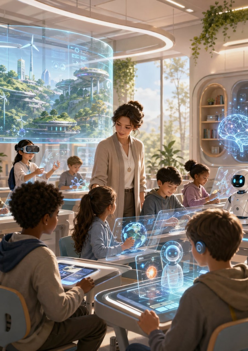 ) Sun’iy intellekt, raqamli texnologiyalar va virtual muhitlar ta’limning ajralmas qismiga aylanadi. O‘quvchi endi faqat darslikdan emas, sun’iy intellekt yordamchisi, interaktiv platformalar, virtual laboratoriyalar va shaxsiy ta’lim dasturlari orqali ham bilim oladi. Har bir bolaning o‘ziga mos o‘quv yo‘li bo‘ladi: kimdir tezroq o‘rganadi, kimdir ko‘proq mashq qiladi, kimdir vizual, kimdir amaliy usulda bilimni yaxshi qabul qiladi. Sun’iy intellekt buni tahlil qilib, ta’limni individuallashtiradi. Ammo bitta muhim savol bor: unda o‘qituvchi kerak bo‘lmay qoladimi? Yo‘q. Aksincha, o‘qituvchining roli yanada muhimlashadi. 2050-yilda o‘qituvchi faqat bilim beruvchi emas, balki yo‘l ko‘rsatuvchi, tarbiyachi, tahlilchi, motivator va insoniy qadriyatlarni saqlab turuvchi shaxs bo‘ladi. Sun’iy intellekt ma’lumot beradi, lekin mehr bermaydi. Texnologiya javob topadi, lekin bolaning ko‘zidagi xavotirni sezmaydi. Platforma topshiriq beradi, lekin o‘quvchiga ishonch bag‘ishlay olmaydi. Sh