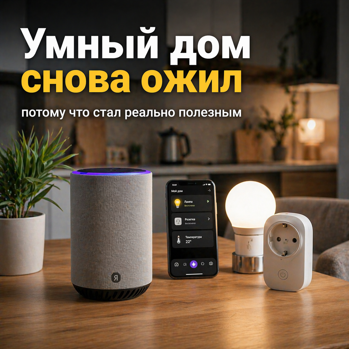 Теперь никто не рвется собирать весь набор сразу, люди берут по одной полезной вещи. Сначала колонка на кухню. Через месяц розетка для обогревателя или торшера. Потом камера в прихожую или комнату. Дальше датчик протечки под стиралку или на кухню. В итоге умный дом собирается кусками, без героизма и без ощущения, что ты затеял стройку века. И вот эта модель покупки для рынка очень выгодна, потому что она ближе к реальной жизни обычного человека.