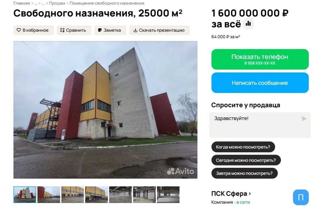 На портале объявлений появилось объявление о продаже производственно-складского комплекса, расположенного в Воронеже на улице Урывского, 6Б. Стоимость объекта составляет 1,6 миллиарда рублей. Общая площадь помещений – 25 тысяч квадратных метров. Продавец характеризует предложение как «большое пустое здание» с офисным блоком площадью около трёх тысяч «квадратов». Комплекс размещается на земельном участке размером два гектара. На территории оборудованы пятнадцать ворот, проведены водоснабжение, канализация, отопление, вентиляция и кондиционирование. Электричество подведено мощностью два мегаватта с возможностью дальнейшего увеличения. На объекте также есть телефония, интернет и сигнализация. Комплекс полностью сдан в аренду. Ранее по этому адресу работал магазин «Маяк», однако, судя по данным онлайн-карт, его там больше нет.