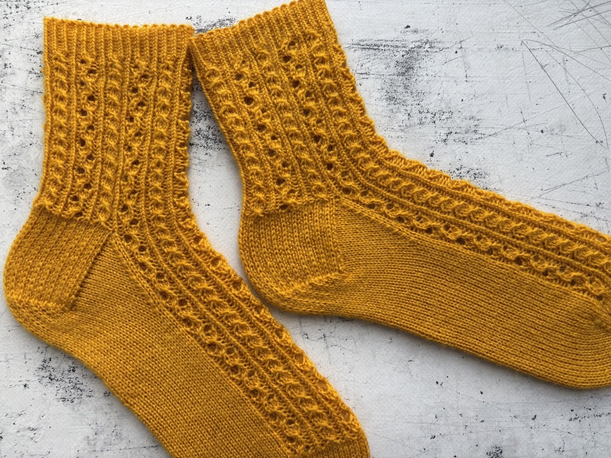 Связала новую пару подарочных носков из новой для себя пряжи: YarnArt Forza Solid. Рассказываю про пряжу, узор и как связать такую же пару. Плюсы - классический носочный состав за бюджетные деньги, приятная на ощупь, много красивых цветов в коллекции, большой моток 100 грамм 420 метров (хватит на 47-ой размер). Минусы - слоится при вязке. И как будто не очень прочная: дважды обрывалась нить при наборе петель - у меня такое впервые. Давно не вязала ажурные носочки, а тут светлая пряжа - всё сошлось! Узор собрала из своих любимых элементов: ажурная дорожка с меняющимся направлением и мушка на трех петлях (или из трех петель три). Схема узора и расшифровка на фото ниже: 1. На 38-ой размер я набрала 66 петель+1 для замыкания в круг. Замкнула вязание и связала резинкой 1х1 всего 10 рядов. Лицевые в резинке - перекрещенные. Спицы толщиной 2,25 мм 2. С 11-го ряда я сразу начала вязать узор - до пятки у меня всего 11 узелков. Затем я перенесла петли, чтобы было спереди одинаково обрамленный