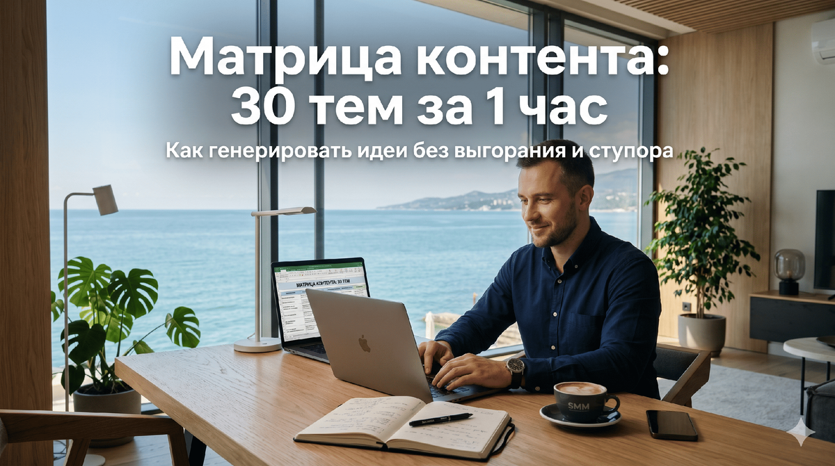 Пару лет назад я смотрел на закат у Черного моря и чувствовал только пустоту. Клиент требовал контент для мебельного производства, а я просто не знал, о чем еще писать. Знакомый SMM-специалист попросил 70 тысяч рублей за скучную таблицу с темами, которые даже не продавали. Я тогда жестко выгорел из-за этой ежедневной ломки головы. Я понял, что грамотная матрица контента спасает от ступора и экономит бизнесу сотни часов. Ниже расскажу про генерацию идей простым языком. Без воды, опираясь на свои 10 лет практики. Вы узнаете: как навсегда закрыть вопрос с темами, где брать идеи для сложных ниш, почему ручной труд устарел и как автоматизировать выпуск публикаций.