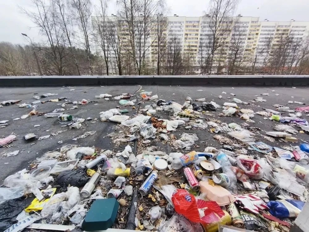Посмотрите, сколько мусора скопилось (вероятно, за зиму) на козырьке пристройки к корпусу 1106
