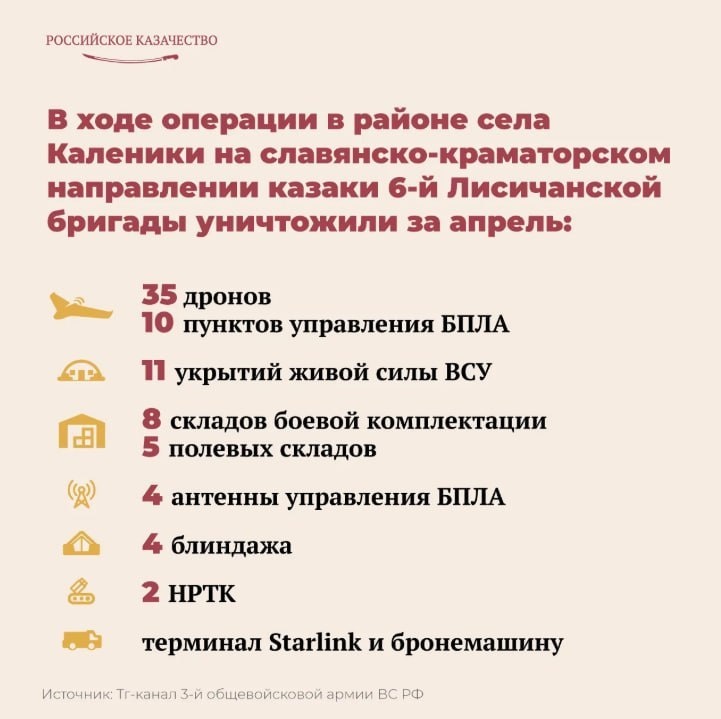 гвардейская мотострелковая Лисичанская казачья бригада имени М.И.Платова. О достижениях казаков на славянско-краматорском направлении сообщается в официальном телеграм-канале 3-й общевойсковой армии Вооруженных сил России. Подробнее – в инфографике 👆 🔊Крымский новостной / Предложить новость