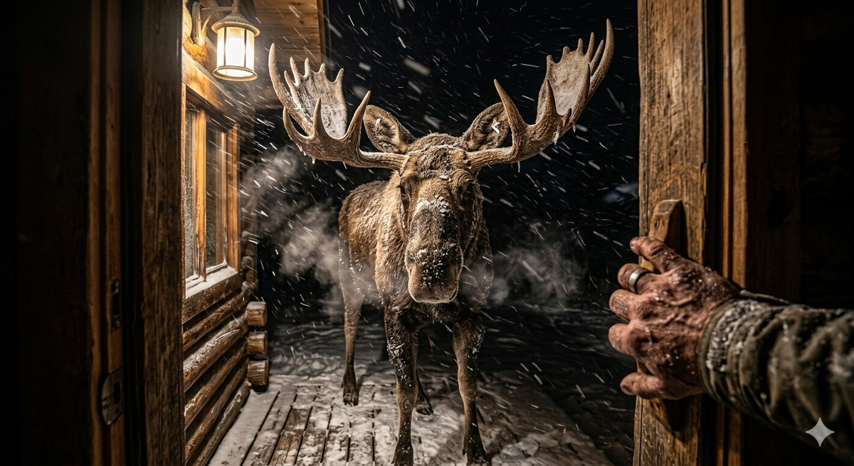 На крыльце, в свете уличного фонаря, стоял ОН. Огромный, величественный самец. Мощная шея, рога — как размашистые дубовые лопаты. Белое пятно на левом ухе — та самая метка, которую Джим запомнил навсегда. Баки вырос. Он стал настоящим хозяином тайги, весом под семьсот килограммов. Зверь стоял неподвижно, от его мощных боков шел густой пар.