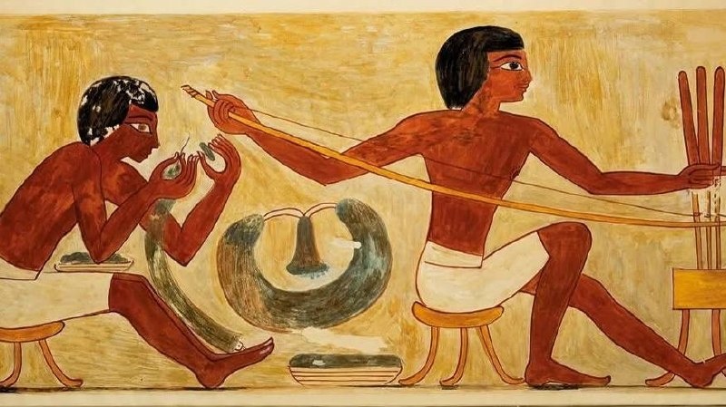 внимания исследователей. Пока совместная британско-австрийская группа не взялась за него всерьёз. Результат: перед нами древнейший известный вращательный инструмент Египта, возраст которого составляет не менее 5300 лет. Новый анализ выявил прямые параллельные царапины у кончика, закруглённые края от многократного вращения и лёгкий изгиб у основания. Такой характер износа возникает не от прокалывания, а именно от вращательного движения против твёрдого материала. На стержне сохранились остатки небольших кожаных петель — аналогичных шнурам, применявшимся в лучковых свёрлах. Принцип работы прост и гениален: лук движется вперёд-назад, шнур раскручивает сверло с высокой скоростью. Именно так в Древнем Египте сверлили отверстия в камне, дереве и кости. Рентгенофлуоресцентный анализ показал, что инструмент сделан из меди, намеренно упрочнённой добавками мышьяка, никеля, серебра и свинца. Серебро и свинец в додинастическом Египте были привозными материалами — а значит, уже 5300 лет назад суще